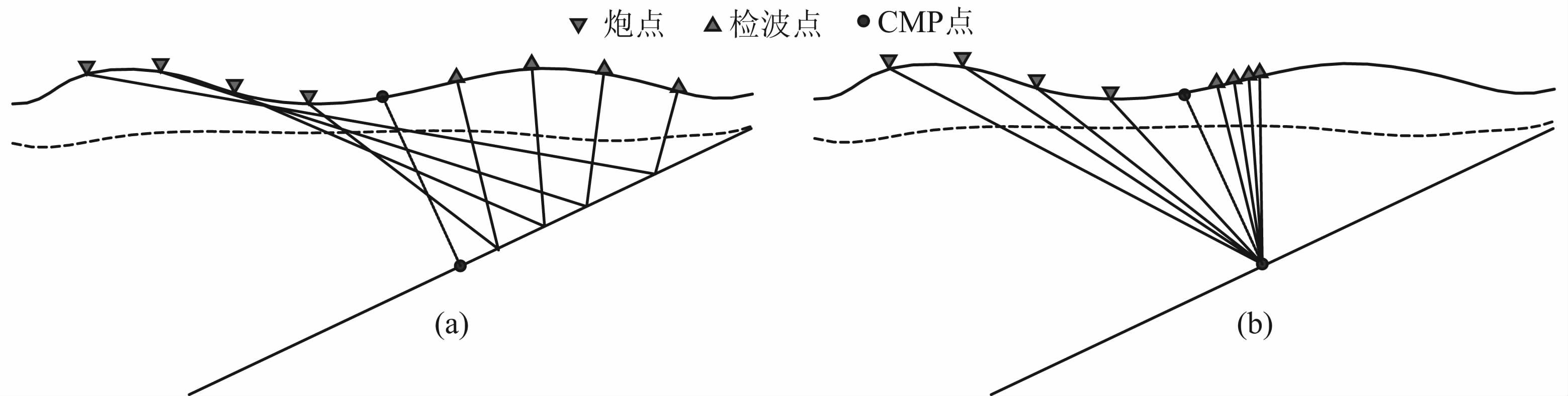 图 5 二维倾斜界面PS波CMP(a)和倾角CCP(b)传播路径图 Fig. 5 The schematic of the spreading path for PS wave using CMP (a) and dipping CCP |