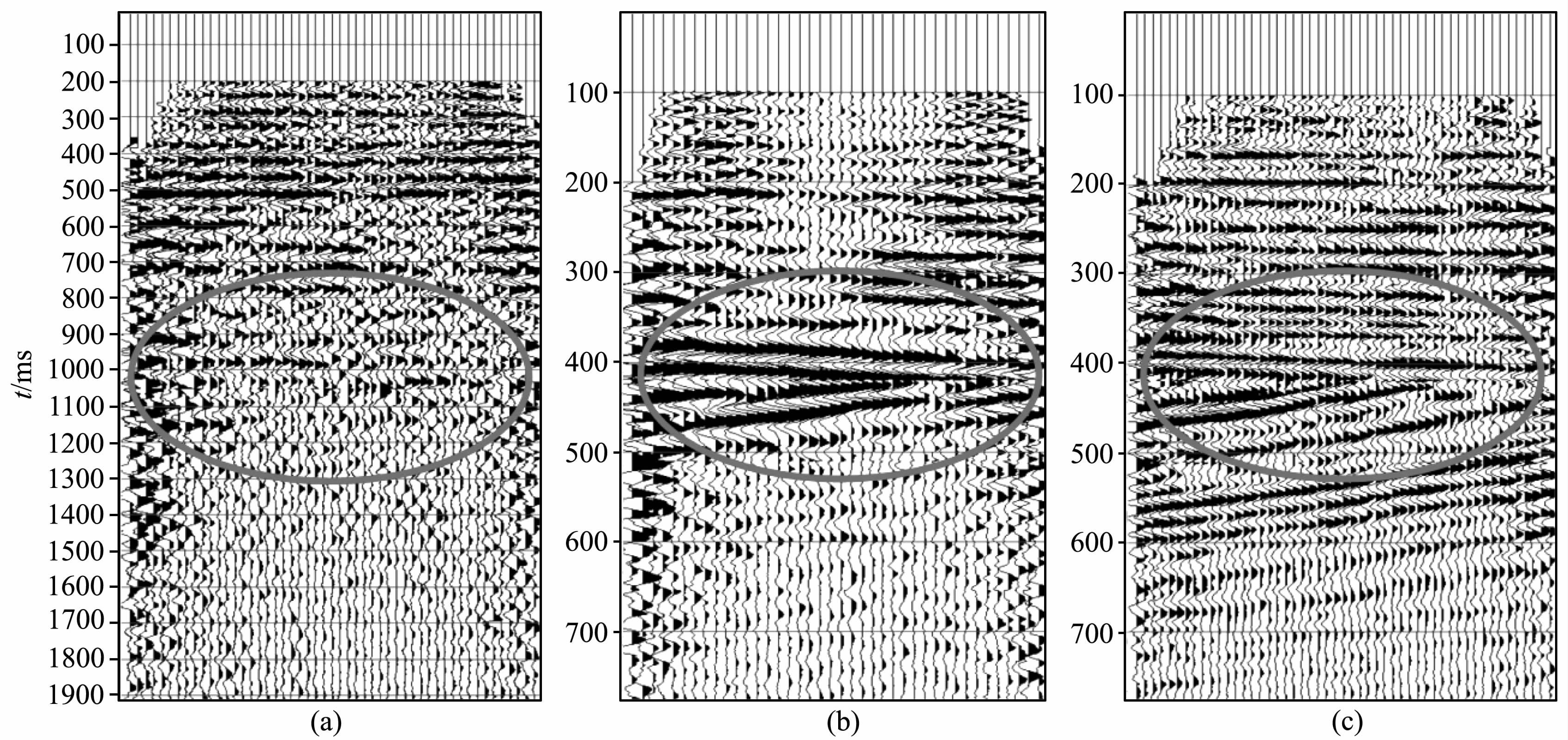 3 不同方法实际资料处理结果对比以某煤区3D3C 实际资料为例,其观测系统依据共中心点方法设计.对此区原始炮集R分量上的PS波分别进行CMP抽道集和倾角CCP抽道集,并对CMP道集采用常规速度分析方法得到叠加成像如图 7a.图 7b为PS波倾角CCP 的初步叠加结果,图 7c为对应的P波叠加剖面.观察可知,PS波倾角CCP的叠加剖面与P波的叠加剖面层位对应较好,反之,PS波CMP的叠加剖面的层位很难与P 波叠加剖面对应.并且PS波倾角CCP 叠加剖面在深部的倾斜层区域叠加成像信噪比很高,而PS波CMP的叠加剖面对应的位置基本没有叠加波组出现.之所以PS波CMP成像质量不好,是因为存在第二节中分析的转换点离散、静校正量较大、动校速度确定不准确和面波影响等四个重要因素的影响.