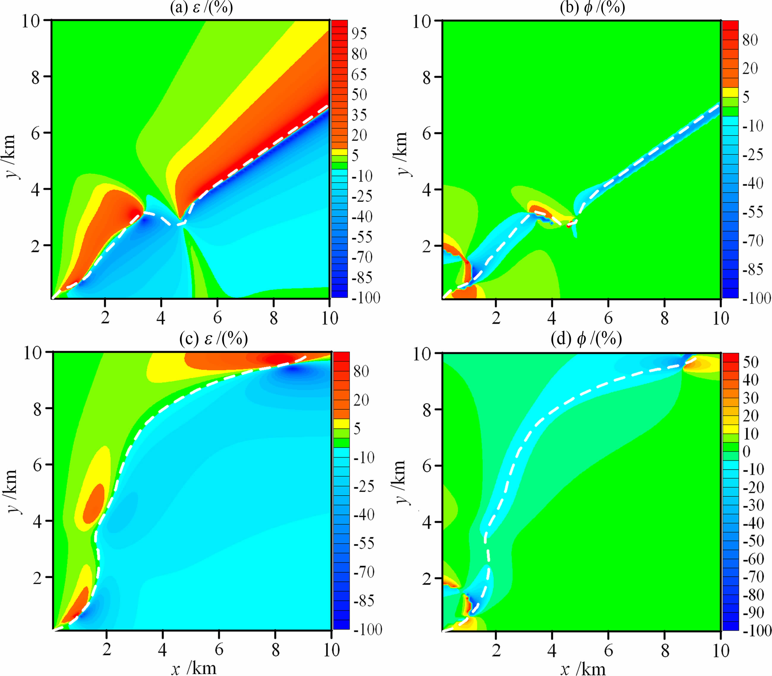 图 9 发射源倾斜角和水平转动角均为12°时产生的振幅和相位误差的平面分布 (a)和(b)是不存在高阻层的情况;()和(d)是高阻层在z=2000 m处的情况. Fig. 9 Magnitude and phase error for horizontal Ex when both the yaw and pitch angle are 12 degrees In (a) and (b),no resistive layer exists, while in (c) and (d) resistive layer is located at z=2000 m |