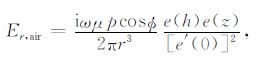 其中,e(z)为方程e″(z)=iωμσ(z)e(z)的解,e(h)和e(0)分别对应z=h和z=0 的情况;角标r,air和$\phi $,air分别代表径向和切向方向的空气波;σ(z)为电导率;ω 为角频率;μ 为空气的磁导率.根据(7)和(8)式推导出空气波Ex场的表达式为