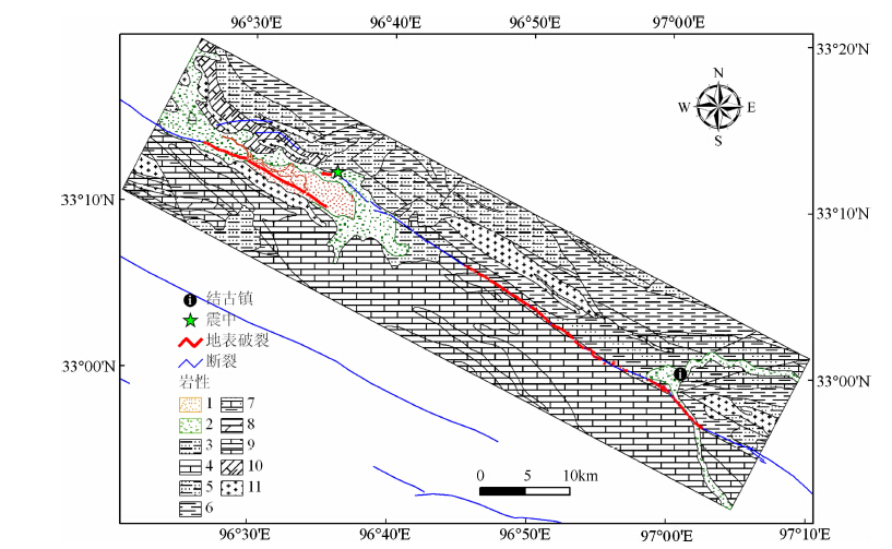 3 玉树地震及诱发滑坡 3.1 地震构造背景2010年4月14日青海玉树Mw6.9级地震发生在青藏高原中部,由于印度板块向青藏高原的推挤作用,导致青藏高原缩短,同时内部的块体沿一些重要的块体边界断裂带发生侧向滑移,造成青藏高原主体向东移动,并在青藏高原内部和块体边边界形成不同规模的走滑断裂系与挤出块体.玉树地震就是在这种地质背景下发生的,为羌塘块体向东运动的结果[24],发震断裂为鲜水河断裂带西段的甘孜-玉树断裂带.甘孜-玉树断裂带规模巨大,西起青海治多县那王草曲塘,经当江、玉树、邓柯、玉隆,至四川甘孜县城南,全长约500km.玉树地震产生了走向约300°,65km 长的地表破裂带,左旋走滑性质,地表破裂带由一系列挤压鼓包与张裂缝相间排列或雁列式裂缝组成,实测最大水平位错约1.8m[25-29].玉树地震破裂过程中的能量主要在两个时间和空间上释放,一个能量释放点是震后6s,位于震中附近;另一个是震后12s,位于震中位置东南,靠近结古镇区域,为玉树地震破裂过程中能量最大的,与实际震害最重的区域相吻合[30].截至2010年4月25日15时00分共记录到玉树Mw6.9 级地震余震总数为1467次,其中3.0级以上余震13个,其中6.0~6.9级地震1个,5.0~5.9级地震0个,4.0~4.9级地震3个,3.0~3.9级地震9个.