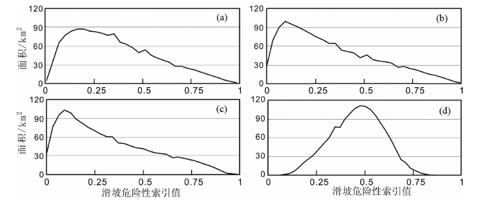 图 6 滑坡危险性-面积对比图 (a)线性核函数;(b)多项式核函数;(c)径向基核函数;(d)S形核函数. Fig. 6 Diagram of landslide hazard probability distribution and area (a) Linear function;(b)Polynomial function;(c)Radial basis function;(d)Sigmoid function. |