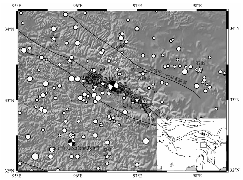 2010年4 月14 日7 时49 分青海省玉树藏族自治州玉树县发生MS7.1(Mw6.8)级地震.根据中国地震台网中心测定结果,玉树地震震中位置为33.2°N,96.6°E,震源深度约14km,由于地震震中距离玉树州州府所在地的结古镇仅30km,地震造成了巨大的经济损失和人员伤亡[1-2].玉树地震发生在青藏高原巴颜格拉块体的中南部,发震断层为NWW-NW 走向的甘孜-玉树断裂.该断裂以左旋走滑运动为主,总长约500km,与鲜水河断裂在甘孜附近呈左阶错列,并与鲜水河断裂共同组成巴颜格拉块体的南边界[3].