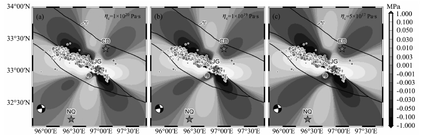 3.2.2 不同黏滞系数对计算结果的影响囊谦地震发生在玉树地震震后一年零两个月,考虑同震及震后黏弹松弛效应对应力场变化的影响时,中下地壳以及上地幔的黏滞系数的不同取值可能会改变囊谦地震震前的应力场分布.Shan等[4]在参数的敏感性分析中,讨论了黏滞系数取值对计算结果的影响,发现中下地壳黏滞系数取值的不同对计算结果的影响要远大于上地幔黏滞系数的取值.因此,我们选取不同的中上地壳黏滞系数,计算了囊谦地震震前黏弹松弛应力场变化,计算中不考虑背景构造应力场,深度截面为9km,有效摩擦系数取中间值0.4,以囊谦地震震源机制解的节面Ⅱ作为接收断层参数.