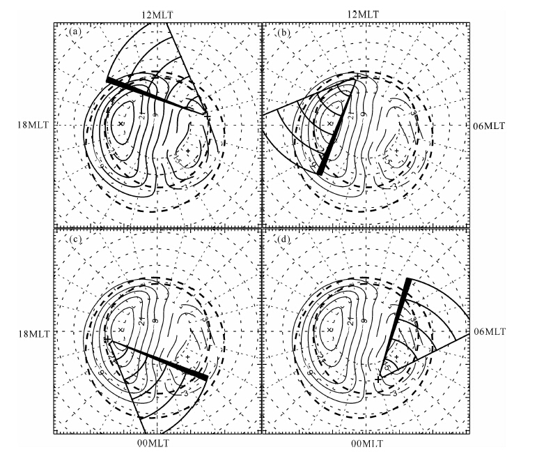 图 11 不同时刻中山站高频雷达的视场(FOV),(a)UT=05,(b)UT=11,(c)UT=17,(d)UT=23.其中黑色阴影为波速15.图中的黑色虚线为Kp=1时的极光卵边界.图中也画出了较为典型的电离层对流双涡 Fig. 11 The FOV of Zhongshan radar at different universal time(UT).The black shadow illustrates beam 15.The dashed lines in dicate the auroral oval boundary.The typical ionospheric convection twin-vortex is also in dicated |