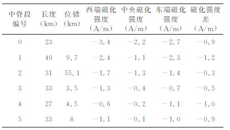 5 中脊的分段性与磁化强度特征得益于测量数据的密度及精度的提高,化极磁异常清晰地反映了西北次海盆的连续磁条带特征,这是在化极前的数据中无法看到的.化极磁异常和磁化强度同时在残留中脊上显示出明显的分段性.从残留中脊段两侧更老的洋壳上也可以找到相应的分段性.整个残留中脊磁异常共分为五个明显的异常段和一个可能的异常段.我们从西向东依次命名为0~5段,其中第0 段为可能异常段.异常区的化极磁异常最大值在0~100nT 之间变化,最小值从-100~50nT 之间变化.若将磁异常形态视为残留中脊的形态,则磁异常的分段性实际上反映了残留中脊的分段性.第1 段与第2 段之间的位错达到50km,1~2段和2~5段之间的位错5~10km 不等.考虑到第1段与2段之间的位错距离较大,地壳年龄的位错也超过1 Ma,因此我们将它归为一级位错(转换断层),而其它四个归为二级位错(非转换断层不连续带).