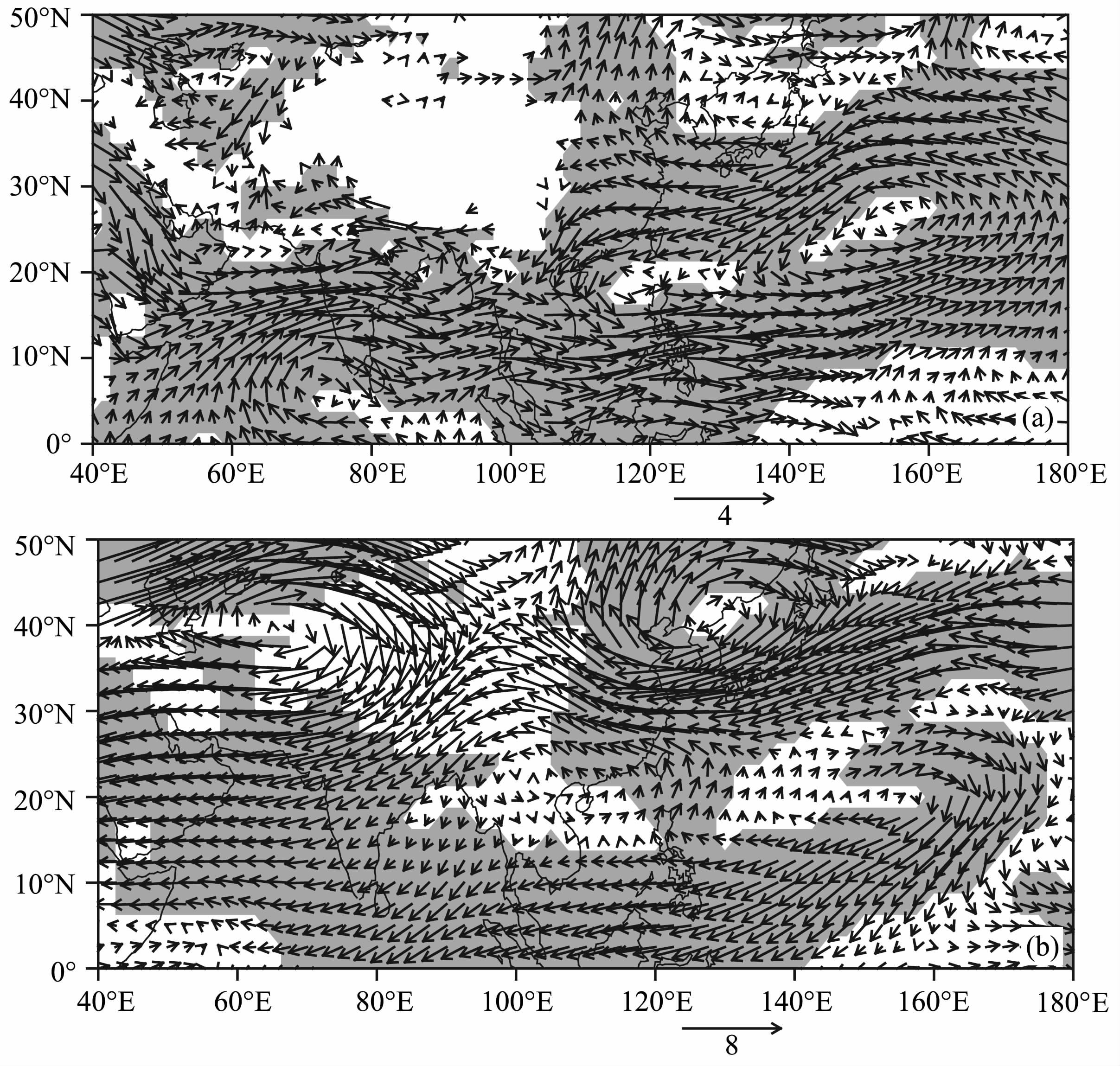 图 8 南亚夏季风强、弱年(a)850hPa和(b)200hPa夏季风场年际分量合成差(单位:m·s-1)阴影区表示通过95%置信度检验的区域. Fig. 8 Composite differences between strong and weak SASM years in the interannual componentsof summer wind (unit: m • s-1) at (a) 850 hPa and (b) 200 hPa Areas significant at 95% confidence level are shaded. |