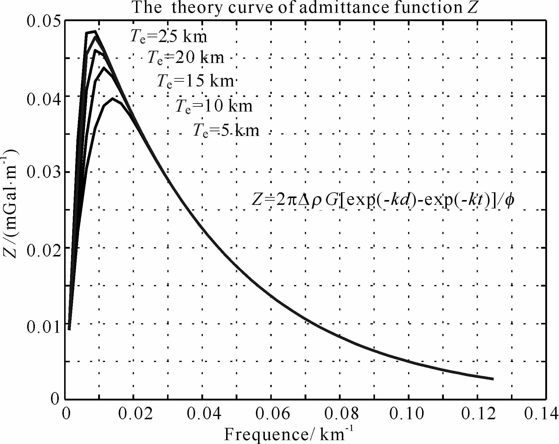 这就是海洋上重力与地形之间的响应函数Z(k)具体表达式.它是频率k=2π/λ 的函数,也是弯曲刚度D的函数.因为弯曲刚度D是板块厚度Te 的函数,因此响应函数Z(k)也是板块厚度Te 的函数.一般选取一个板块厚度Te 的数值后,就可以作出一条响应函数Z(k)随频率k而变化的曲线.选取多个板块厚度Te 的数值,可作出多条响应函数Z(k)随频率k而变化的曲线,形成理论Z(k,Te)曲线族(图 3).