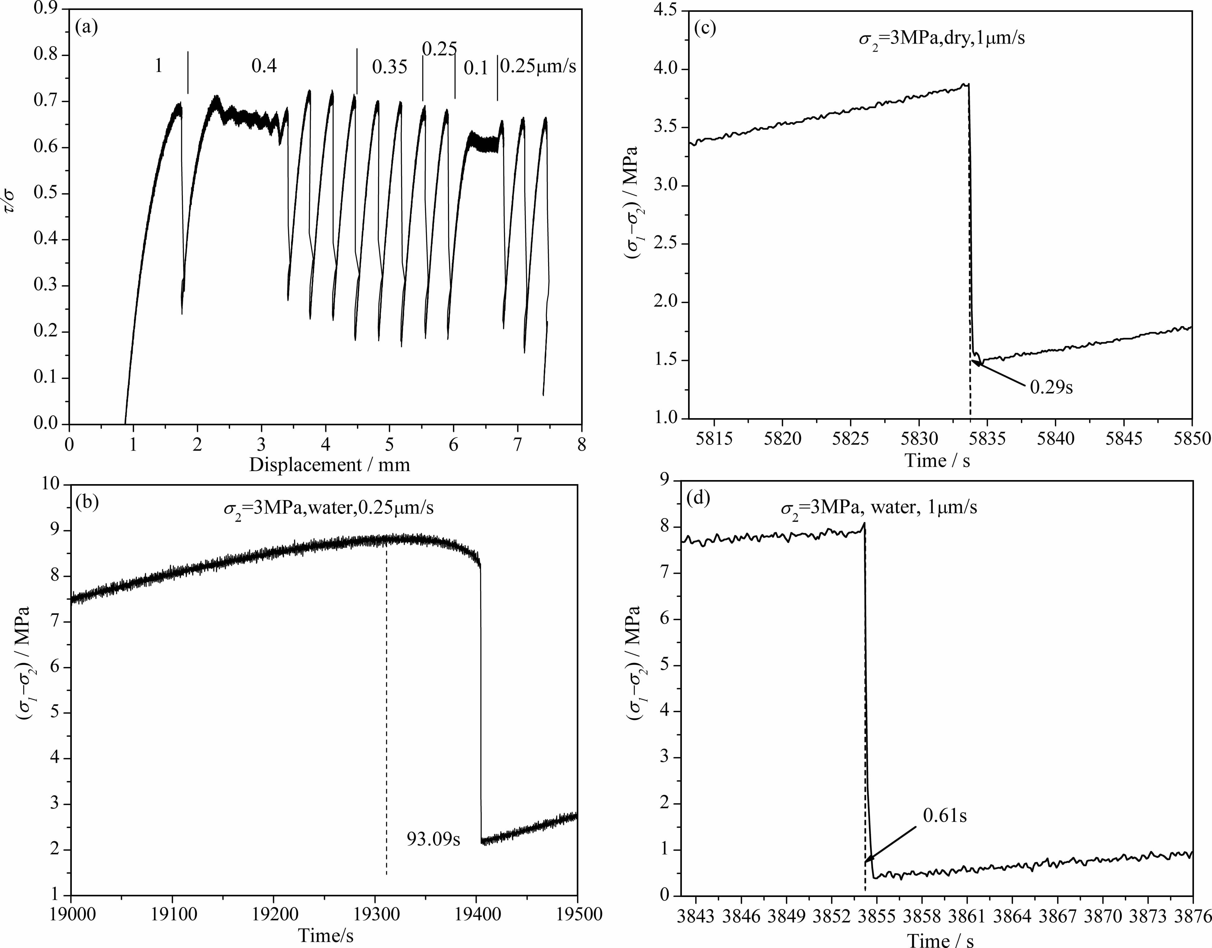 图 4 岩盐断层带摩擦滑动的摩擦系数-位移曲线及两个黏滑事件的时间过程 (a)速度依赖性转换带的摩擦系数-位移曲线;(b)转换带一次黏滑的时间过程;(c)σ2=3 MPa, 干燥条件下的一次黏滑的时间过程;(d)σ2=3 MPa, 含水条件下的一次黏滑的时间过程. Fig. 4 Friction coefficient-displacement curve of halite gouge and stress-time curves of two stick-slip events (a) Friction coefficient-displacement curve in transition region of velocity dependence; (b) A stick-slip event in the transition region; (c) A stick-slip event under a2=3 MPa, dry condition.(d) A stick-slip event under a2=3 MPa, wet condition. |