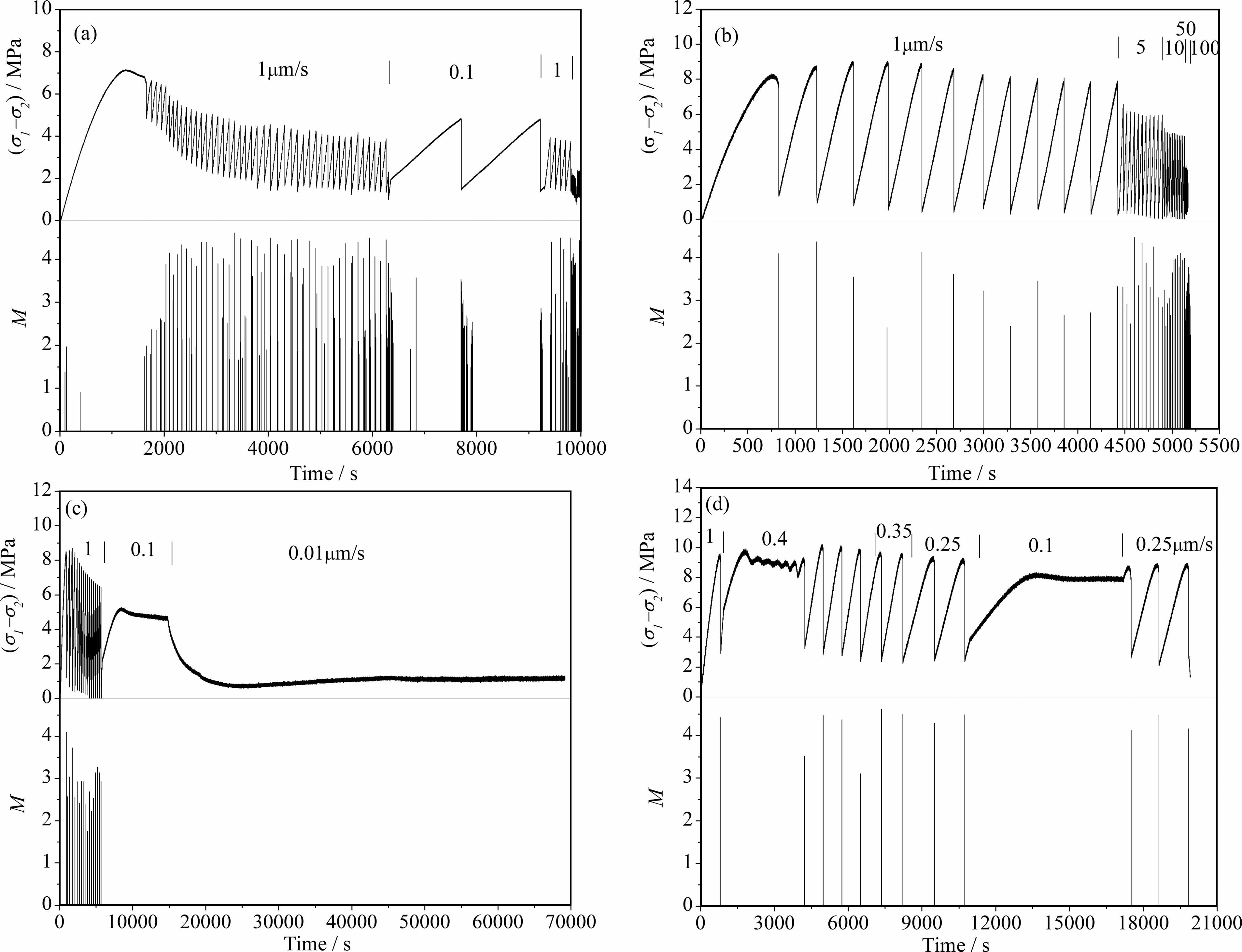 3.2 声发射活动特征在进行岩盐断层带摩擦滑动速度依赖性实验的同时,我们还观察了相应的声发射活动.图 6是岩盐断层带在σ2=3 MPa、干燥和含水两种条件下的差应力-时间曲线及对应的M-t图.可见,在干燥条件下(图 6a),声发射活动较强,一次黏滑事件通常对应一丛声发射事件;含水条件下(图 6b,c),声发射活动较弱,一次黏滑仅对应一个声发射事件,稳定滑动时没有声发射事件;在速度弱化向速度强化的转换域(图 6d),加载速度为0.4μm/s的振荡阶段并无相应的声发射事件,但之后的一次黏滑对应一个声发射事件.实验结果也表明增大σ2 并未使岩盐断层声发射活动性增强.这3 种条件下声发射强度均没有特别明显的差别,声发射波的傅里叶频谱分析结果显示其优势频率也无明显差别.