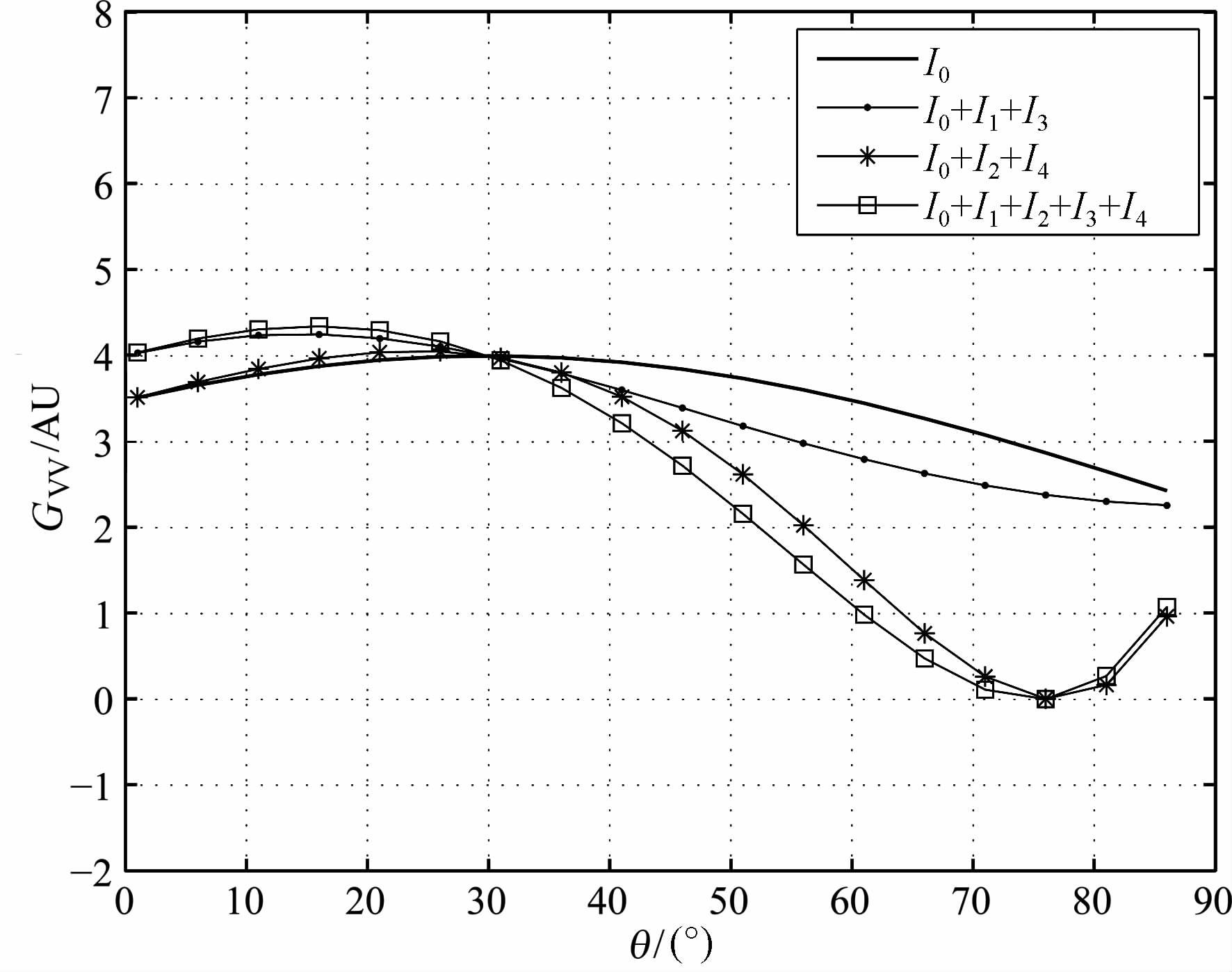 图 1表示的是入射角为30°时核函数中的各项的贡献,可以看出I1和I2的贡献,可能比I3和I4大,但是我们注意到在分析式中I1项与I3项的符号是相反的,因而在量值有相互抵消的作用,这一点也可以从图 2中表现出来,即I0+I1+I3的组合对I0的改变量要小于I0+I2+I4对I0的影响.同样,图 3和图 4 分别表示了H-H 极化时核函数中的各项极化散射的影响.可以看出I1和I2的贡献可以看作是一小量,而I3可能表现出不合理的“发散"特性,这可能是由于在近似表示时引入的.尽管如此,以上结果也表明,在考虑散射的计算问题中,极化核函数中的第I2和I4项是对极化的敏感性是有影响的.