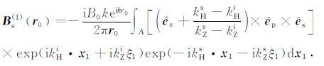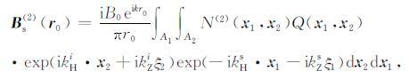 Elfouhaily[17]曾采用了类似的形式对Holliday[16]的形式进行了简化,但是考虑到高程差会与积分变量产生较强的耦合,因而在Elfouhaily[11]中恢复了原有的高程差的表示形式.这样我们可以得到关于磁场的二次迭代新的补充场的表示形式,通过简化可以表示为: