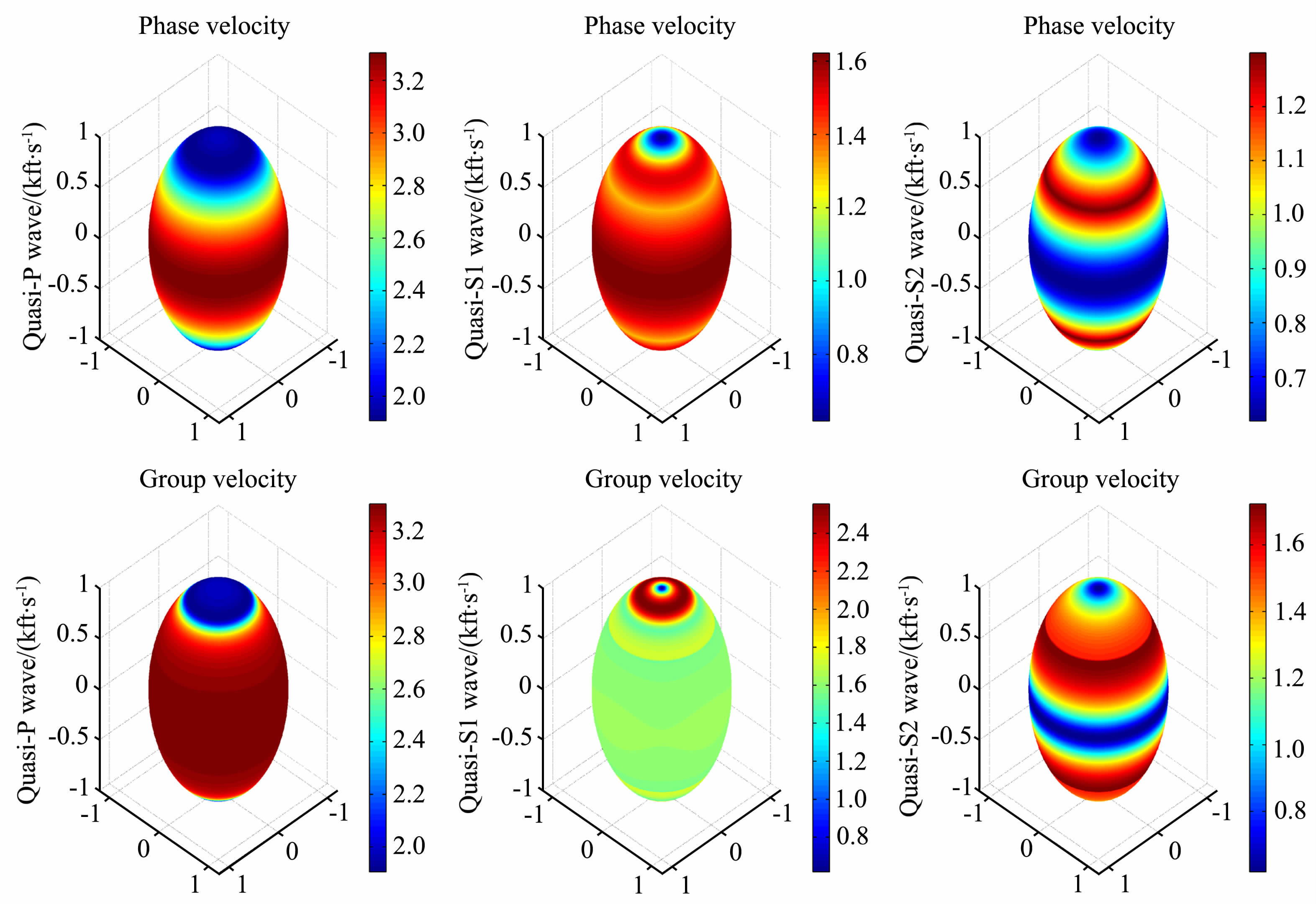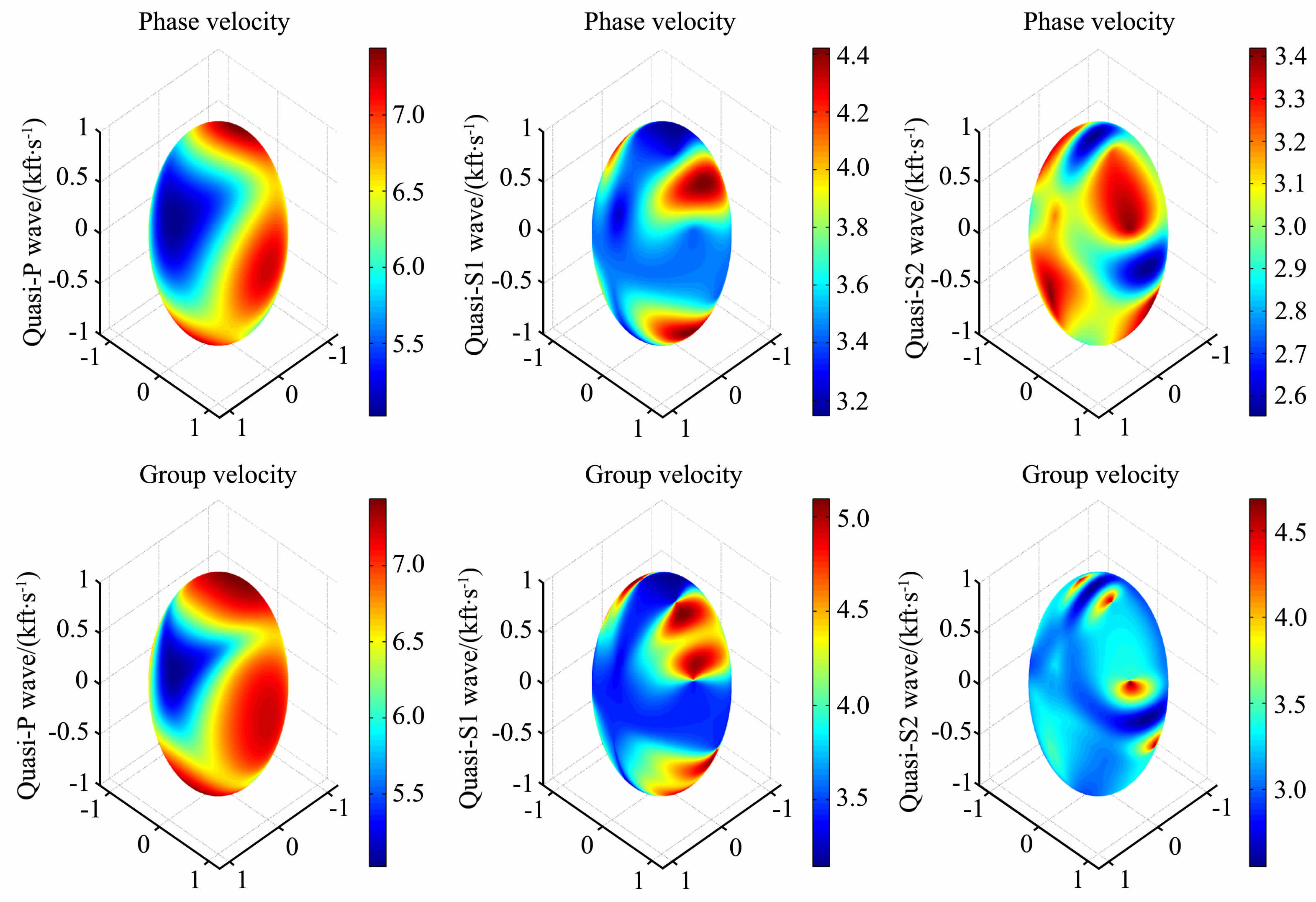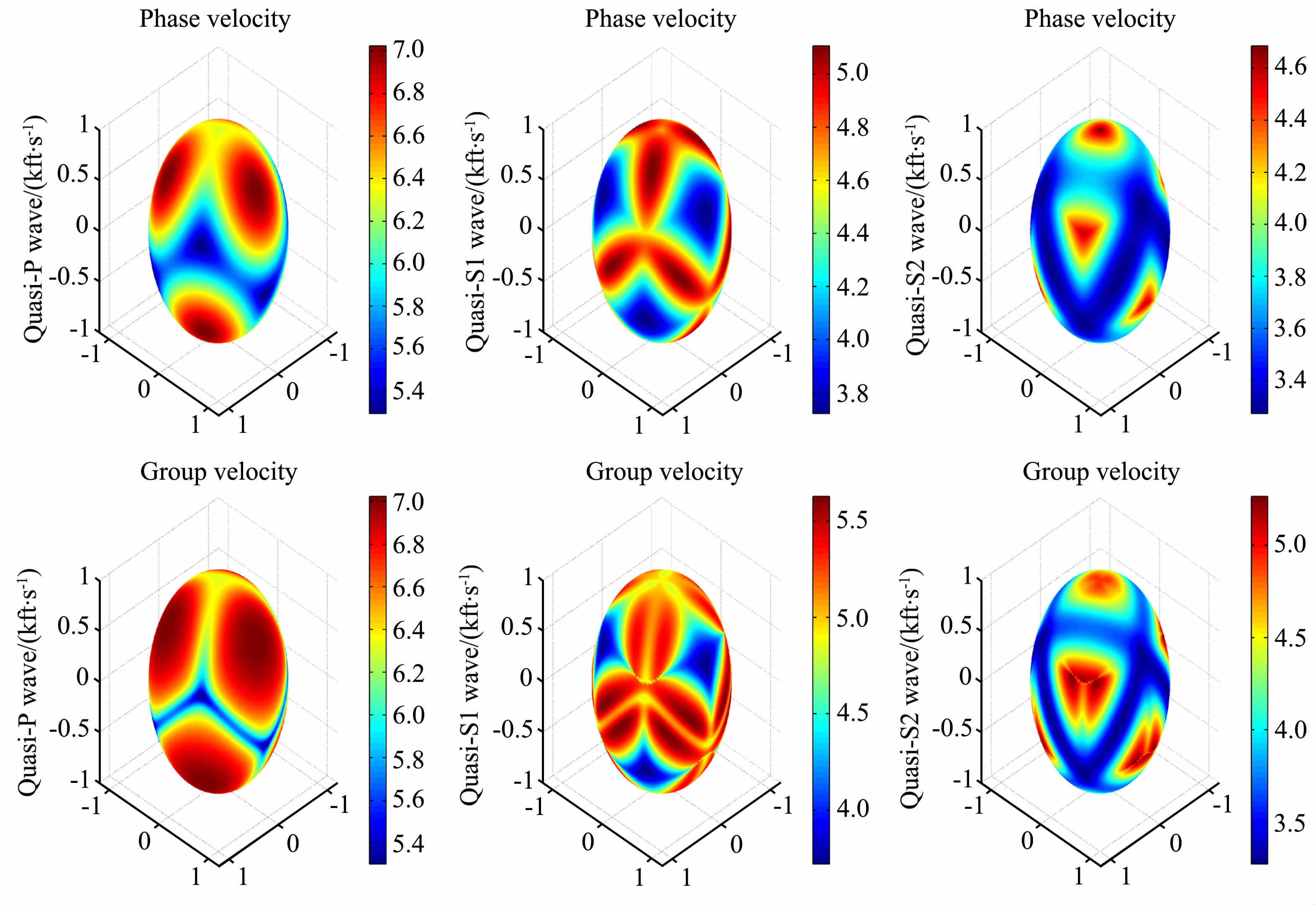 图 1 石英晶体的3D相速度面和群速度面,不同颜色代表速度,1 kft/s = 0.3048 km/s Fig. 1 3D phase velocity surfaces and group velocity surfaces of quartz,colors denote velocity in kft/s |