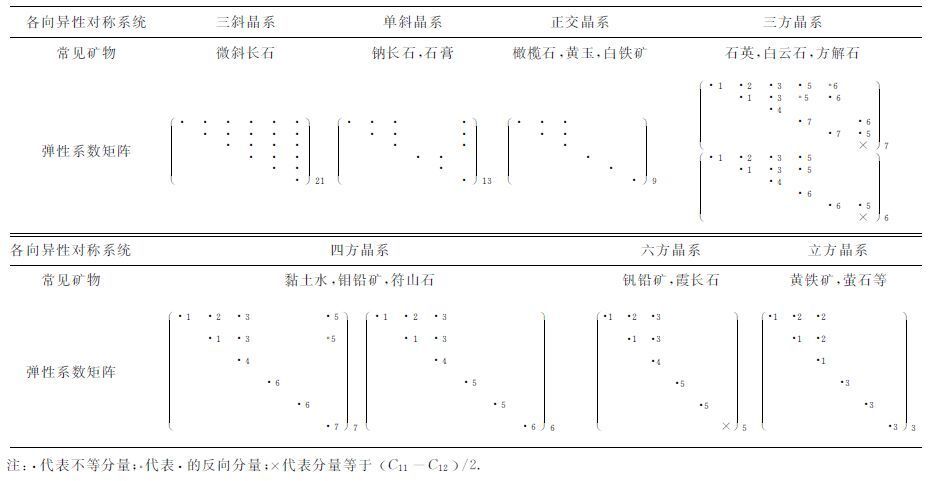 固有各向异性对称系统可分为七类[2, 10],按照对称程度由低到高依次为三斜晶系、单斜晶系、正交晶系、三方晶系、四方晶系、六方晶系和立方晶系.表 1给出各个对称系统对应的代表矿物和弹性系数矩阵.由于应力张量和应变张量的对称性质,弹性系数矩阵为对称矩阵,表 1只给出其上对角元素.弹性系数矩阵右下角数字代表矩阵中包含不等元素的个数,至多为21个.而且,各向异性对称系统越复杂,不等元素个数越多.