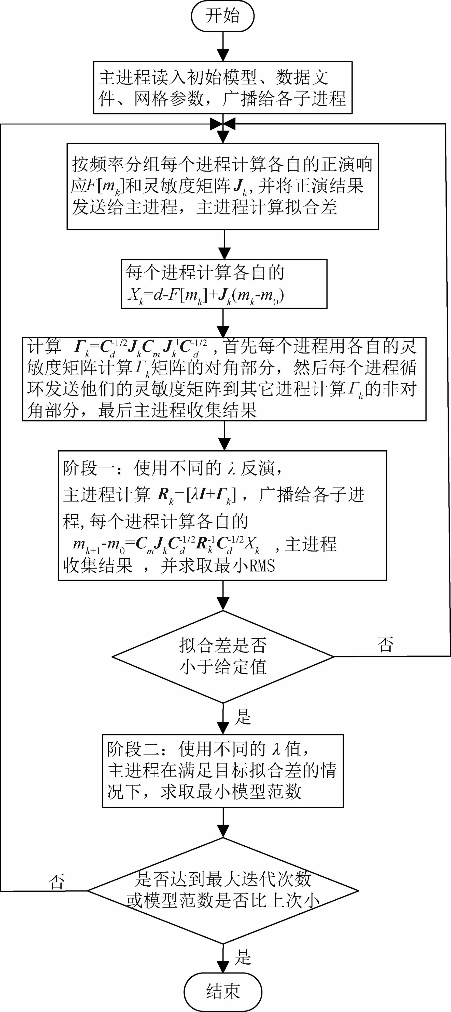 确定好各部分的并行算法后,即可得到总体的并行方案,图 2为大地电磁三维数据空间反演并行算法流程图.