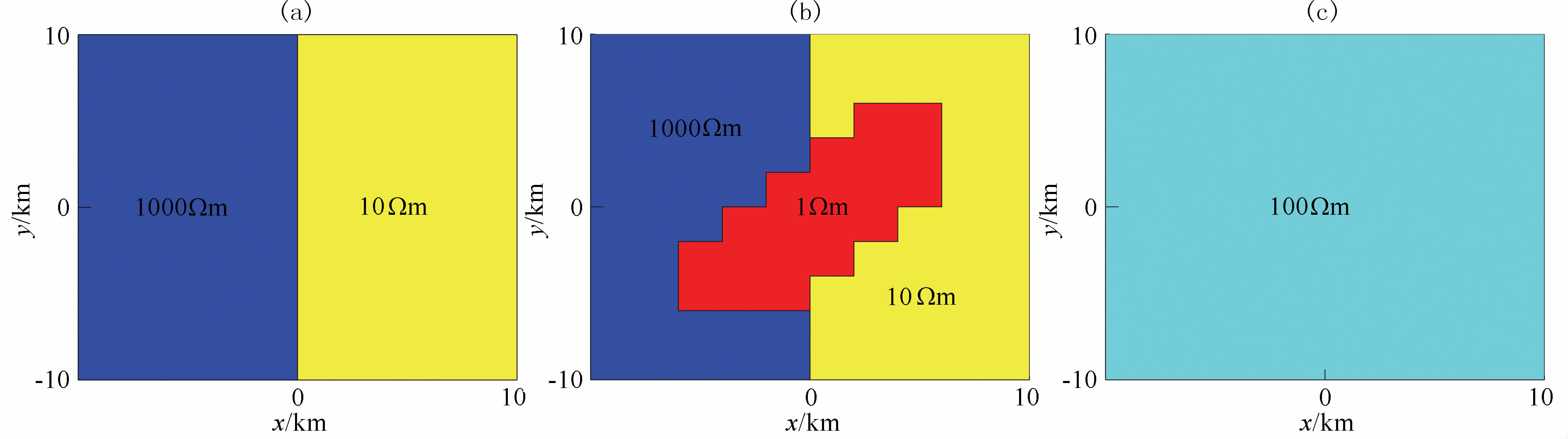 设计的楔形体复杂模型如图 7所示:(a)中左边块状体电阻率为1000Ωm,右边块状体电阻率10Ωm;(b)中左右两边块状体电阻率和(a)相同,不同的是中间对角线处有一电阻率为1Ωm 的楔形块状体,台阶长高均为2km;(c)中是电阻率为100Ωm 的均匀半空间.和模型一相同,数据有25个测点,采用全张量阻抗反演(即 Z x x 、 Z x y 、 Z y x 、 Z y y 全部参加反演),数据加入的随机误差取.Z x y Z y x .1/2 的5%,网格剖分为 N x =34, N y =34, N z =26,频点数为16 个(从320Hz到0.005Hz),初始模型为100Ωm 的均匀半空间,迭代10次反演终止,数据拟合差为3.203,图 8为反演结果在不同深度上的切片图,图 9 为反演结果在 x =0处的垂直断面图.从图中可以看出,反演得到的地电模型较好地反映了真实模型的形态和位置分布.