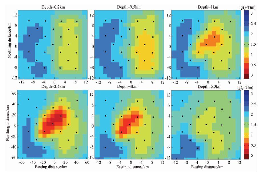 图 8 模型二的反演结果在不同深度的水平截面图 “·”表示测点位置. Fig. 8 Horizontal slice of inversion results for model I at different depths “ • ”denotes MT site |