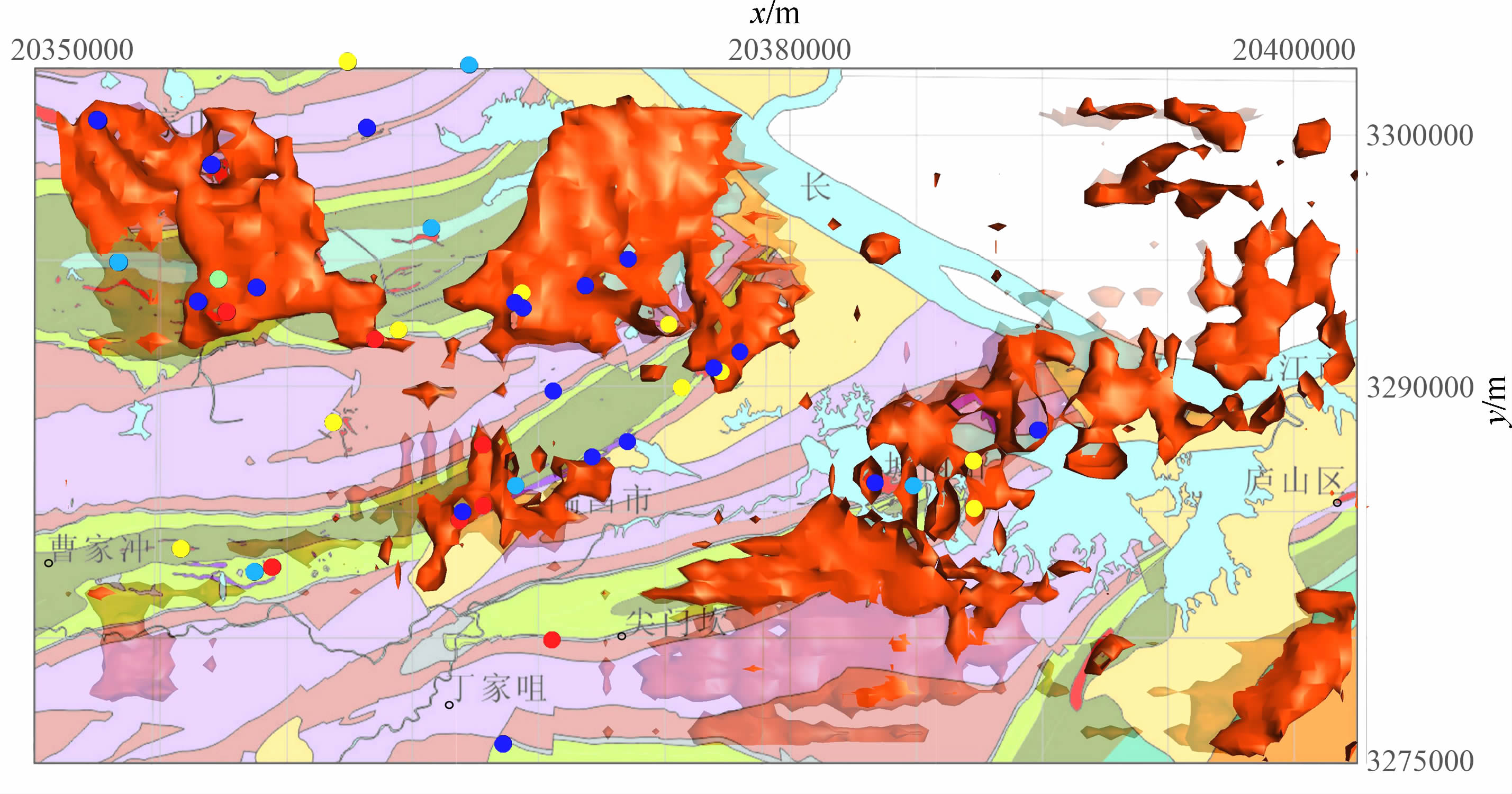 CGSM 部分代表岩体分布范围.图 8是根据磁化率推测的九瑞矿集区岩体分布三维图,其形态反映了岩体的三维展布.从图中可以看出,反演所得出岩体位置基本能与地质露头对应,中部地区以中小型岩体成带出现为主要特征,只有城门山岩体规模较大,北部和西北部地区两个岩体相对区内其他岩体其规模巨大.