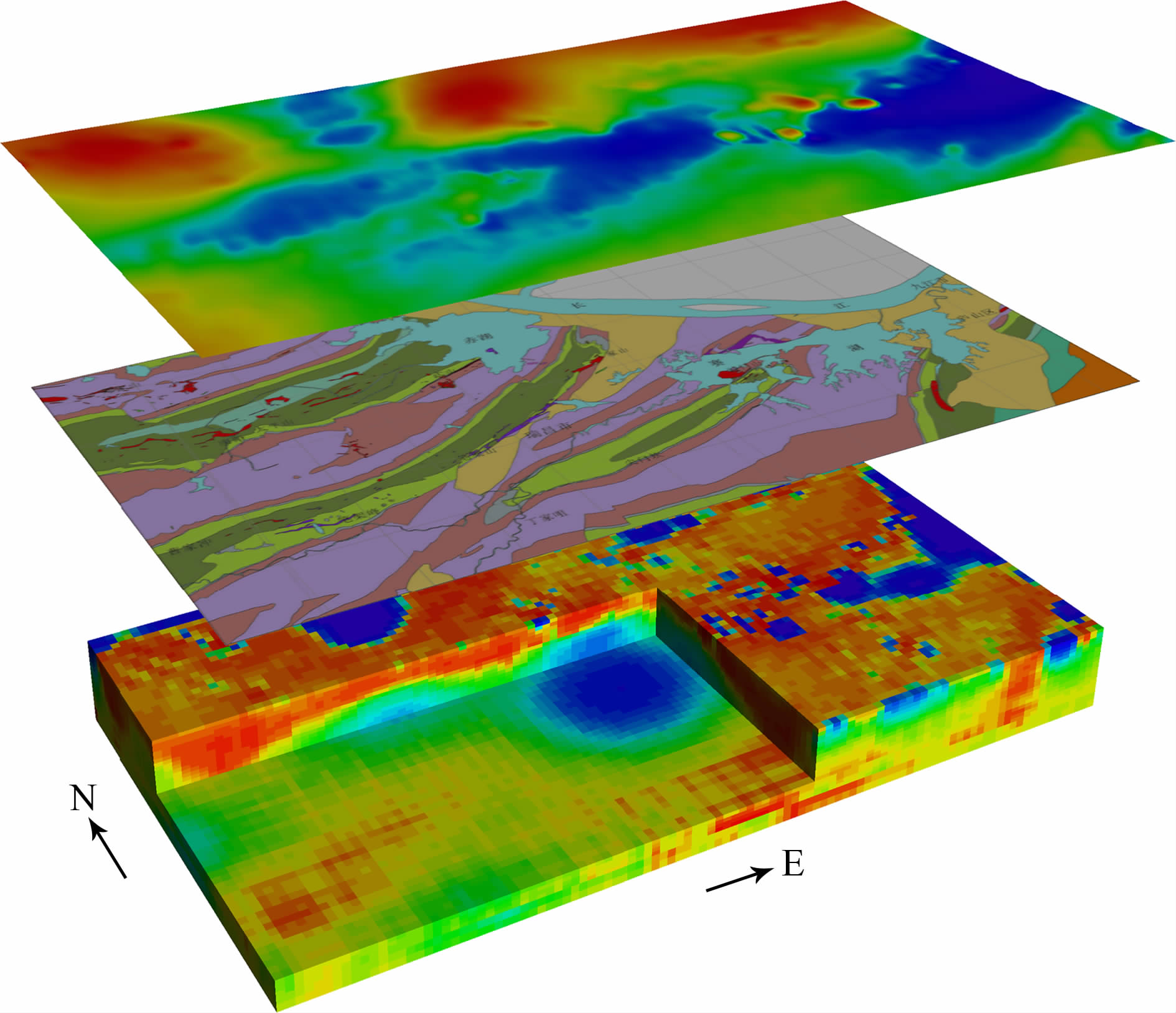 图 7 九瑞矿集区航磁3D反演成像结果 (上层为航磁化极异常,蓝色到红色表示磁异常从低到高变化; 中间层为地质图;下层为磁化率切片,蓝色到红色表示磁化率 从低到高渐变) Fig. 7 3D aeromagnetic inversion imaging result of JiuRui ore district (Upper: Aeromagnetic anomaly,color change from blue to red shows change of magnetic anomaly from low to high; Middle: Geological map; Lower: Section of susceptibility,changes from blue to red shows the gradual change of susceptibility from low to high) |