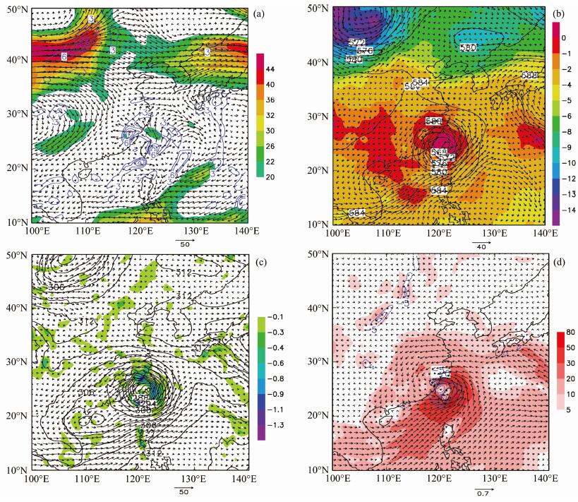 图 1 2009年8月8日1200 UTC(a)200 hPa水平风矢量(箭头)、水平风速(彩色填色区,m·s-1)和正值散度(等值线,10-5s-1);(b)500 hPa位势高度(等值线,10gpm)、水平风矢量(箭头)和温度(彩色填色区,K);(c)700hPa位势高度(等值线,10gpm)、水平风矢量(箭头)和负值散度(彩色填色区,10-5s-1);(d)925hPa水汽通量矢量(箭头)、负值水汽通量散度(等值线,10-7s-1)和水汽通量(彩色填色区,10-4 m·s-1) Fig. 1 (a) The horizontal wind vector (arrows), wind speed (shaded, m·s-1) and positi vevalue of divergence (contour, 10-5s-1) at 200hPa; (b) the geopotential height (contour, 10gpm), horizontal wind vector (arrows) and temperature (shaded, K) at 500 hPa; (c) the geopotential height (contour, 10gpm), horizontal wind vector (arrows) and negative value of convergence (shaded, 10-5s-1) at 700 hPa; (d) the water-vapor flux vector (arrows), negative value of divergence of moistture flux (contour, 10-7s-1) and magnitude of the water-vapor flux (shaded, 10-4 m·s-1) at 925 hPa at 1200 UTC 8 Aug 2009 |