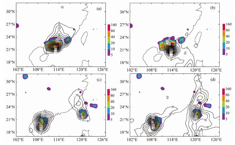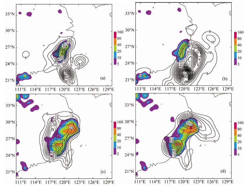 图 12 2009年7月19日0000 UTC(台风“莫拉菲”)(a,b)和2009年8月6日0600 UTC(台风“天鹅”)(c,d)24h预报的6 h降水量,其中(a)和(c)为波作用密度预报降水(等值线,mm),(b)和(d)为GFS模式预报降水(等值线,mm),彩色填色区代表 6 h观测降水(mm) Fig. 12 The 24-h simulations of 6-h precipitations of the typhoon Molave at 0000 UTC 19 Jul 2009(a, b) and the typhoon Goni 0600 UTC 6 Aug 2009 (c, d), where (a, c) is the precipitation forecasting from wave-activity density (contour, mm), (b, d) is the precipitation forecasting from GFS (contour, mm) and the shaded is the observation of 6 h precipitation (mm) |