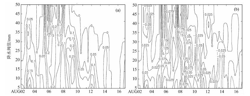 图 13 波作用密度降水预报ETS评分(a)及其与GFS降水预报评分的差(b) Fig. 13 The ETS score of the 6 h-precipitation forecast from the wave-activity density (a) and the ETS difference between the wave-activity density and GFS |