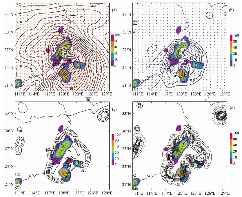 图 2 2009年8月8日1800 UTC3.25km等高面(a)水平风速(等值线,m·s-1)和水平风矢量(箭头),(b)扰动水平风速(等值线,m·s-1)和扰动水平风矢量(箭头),(c)广义位温(等值线,K)和(d)扰动广义位温(等值线,K),其中,彩色填色区代表观测6 h累积降水(mm) Fig. 2 (a) The horizontal wind speed (contour, m·s-1) and wind vector (arrows), (b) the pterturbation of horizontal wind speed (contour, m·s-1) and wind perturbation vector (arrows), (c) the generalized potential temperature (contour, K) and (d) the perturbation of generalized potential temperature (contour, K) at the 3.25 km altitude, where the shaded denotes the observation of 6-h accumulatied rainfall |
