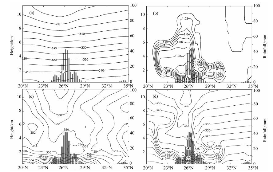 图 3 2009年8月8日1800 UTC位温(a)(单位:K),潜热凝结函数(b),相当位温(c)(单位:K)和广义位温(d)(单位:K)在沿119°E的经向-垂直剖面内的分布,其中,灰色直方图代表观测的6 h累积降水量(mm) Fig. 3 The meridional-vertical cross sections of potential temperature (a)(Unit:K), latent heating condensation function (b), equivalent potential temperature (c)(Unit:K) and generalized potentialt emperature (d)(Unit:K) along 119°E at 1800 UTC 8 Aug 2009, where the gray thin bar denotes the observation of 6 h-accumulated surface rainfall (Unit:mm) |