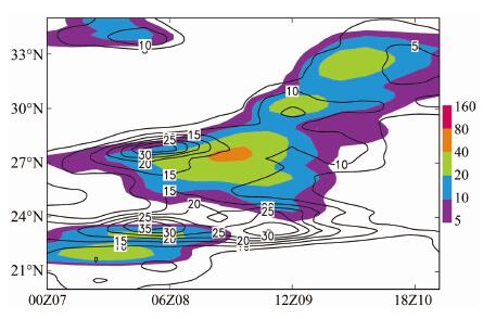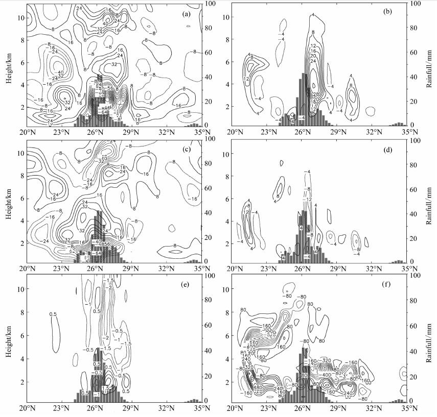2009年8月8日1800 UTC台风中心位于台湾海峡,西侧眼墙覆盖闽浙沿海,局地发生强降水.如图 3所示,在沿119°E的垂直剖面内,6 h累积观测降水主要出现在24°N-28°N,其上空为凝结潜热函数高值区,从近地面垂直伸展到10km高度,高值中心位于1.5~3km高度区间,代表降水区对流层存在显著的凝结潜热释放.在凝结潜热函数影响下,强降水中心北侧2~3km高度区间存在相当位温θse的极小值;2km以下高度的θse垂直梯度为负值,对流层低层处于位势不稳定状态,存在潜在不稳定能量,适当的触发条件可促进强对流发生发展.凝结潜热函数的垂直分布也使得广义位温等值线从降水区对流层高层向下伸展,呈漏斗状分布,其两侧及底部等值线密集,水平和垂直梯度明显.由于位温等值线比较平直,因此广义位温的垂直分布结构主要由凝结潜热函数垂直结构决定,而凝结潜热函数的异常主要由相对湿度幂指数造成,其作用是放大降水区的凝结潜热函数,缩小非降水区的凝结潜热函数,增大降水区与非降水区凝结潜函数之间的梯度.