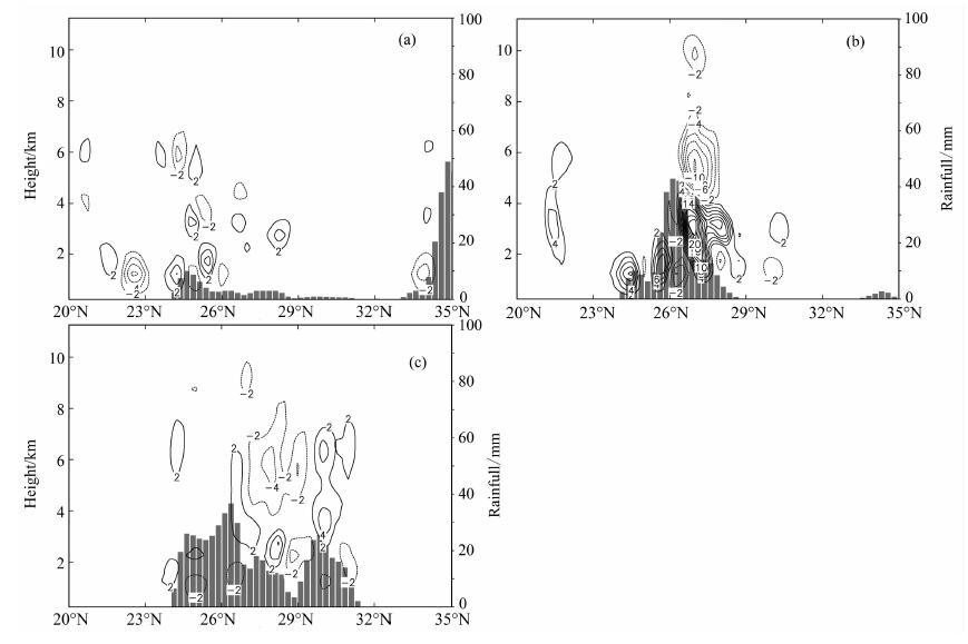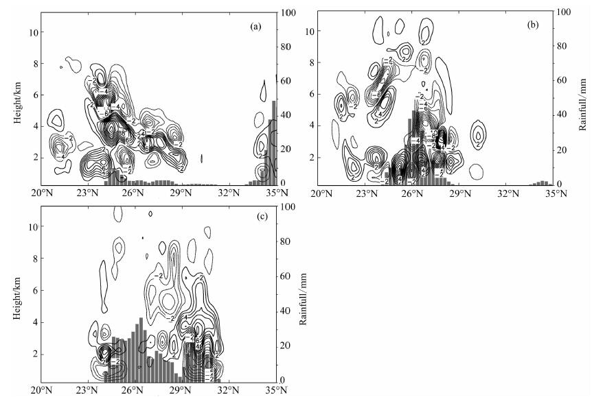 图 5 2009年8月7日1800 UTC(a),8日1800 UTC(b)和9日1800 UTC(c)波作用密度A(10-8K·m-1·s-1)在沿着119°E的经向-垂直剖面内的分布,其中,灰色直方图代表观测的6 h累积降水(mm) Fig. 5 The meridional-vertical cross sections of A(Unit:10-8K·m-1·s-1) at 1800 UTC 7 Aug (a), 1800 UTC8 Aug (b), and 1800 UTC9 Aug 2009 (c) along 119°E, where the graythin bar denotes the observation of 6 h-accumulated surface rainfall (Unit:mm) |