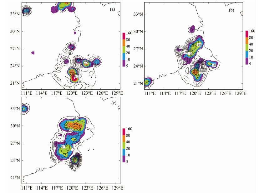 图 11为利用GFS24h预报场计算的波作用密度预报降水的水平分布.如图所示,8日1200 UTC波作用密度预报降水区覆盖观测降水区,但水平范围略大.由于台湾地区没有观测降水资料,因此那里的波作用密度预报降水没有对应观测降水.GFS模式预报降水的主体位于台湾岛,大陆地区模式预报降水偏弱,位置偏东南.9日1200 UTC台风登陆后,波作用密度预报降水的落区与观测降水区相重叠,但预报降水中心略微偏离观测降水中心.虽然GFS模式预报降水与观测降水的落区比较匹配,但模式预报降水中心位于观测降水区边缘.可见,波作用密度预报降水对台风Morakot(2009)的观测降水有较好的再现能力.对于其他台风个例,例如,台风“莫拉菲”(2009)和“天鹅”(2009),如图 12所示,波作用密度24h预报降水区(即利用GFS 24 h预报场资料计算波作用密度,然后由(34)式计算得到预报降水)与观测台风降水区相重叠,二者的中心位置比较接近. GFS模式预报降水的中心位置与观测偏差较大.总之,波作用密度预报的降水能够反映实际台风暴雨的落区,因此波作用密度降水预报方程对台风暴雨有一定的预报能力.