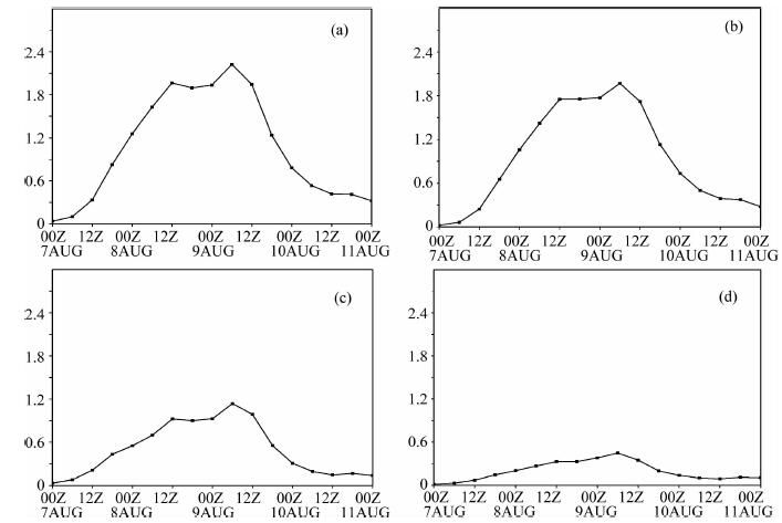 图 11 2009年8月8日1200 UTC(a,b)和9日1200 UTC(c,d)24h预报的6 h降水,其中(a)和(c)为波作用密度预报降水(等值线,mm),(b)和(d)为GFS模式预报降水(等值线,mm),彩色填色区代表观测的6 h累积降水(mm) Fig. 11 The 24h simulations of 6 h-accumulated precipitation at 1200 UTC 8 Aug 2009(a, b) and 1200 UTC 9 Aug 2009 (c, d), where (a, c) is the precipitation forecasting from wave-activity density (contour, mm), (b, d) is the precipitation forecasting from GFS (contour, mm) and the shaded is the observation of 6-h precipitation (mm) |