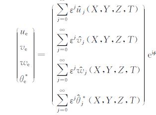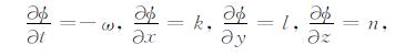 其中,ω,k,l和n分别为局地频率和x,y,z方向的局地波数,它们都是慢时空尺度(X,Y,Z,T)的函数,并满足如下关系: