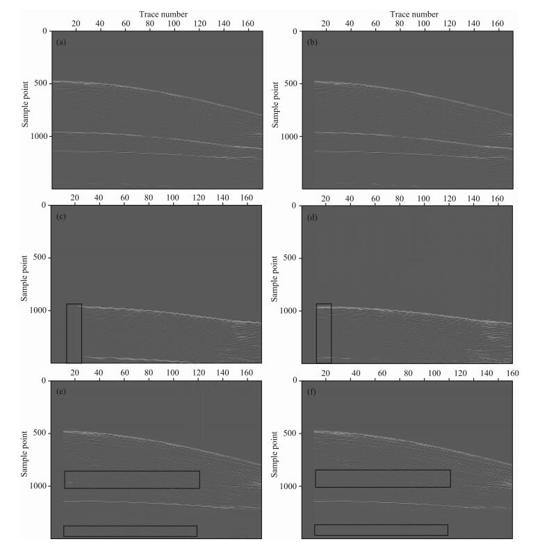 为验证本文方法对空间假频数据的有效性,文中设计了一个洼陷模型进行了数据试算.该洼陷模型的速度场如图 2所示,表层速度是渐变的,从1200m/s变化到1600m/s,第二层至第五层速度依次为2000m/s、2600m/s、3500m/s、4500m/s.采用中间放炮两边接收的采集方式,共121炮,每炮121道接收,每道750个采样点,采样率为4ms.图 3a为第61炮的单炮数据.图 3b为第61炮数据的FK频谱图,可以看出该炮记录存在严重的空间假频.图 3c和图 3d分别用SRME方法和本文相关迭代方法预测的多次波模型道.可以明显看出,本文方法可以大大减小假频的引入,由于本文方法存在矩阵求逆,这会在多次波模型中引入了少量的噪声,但产生的噪声会在后续的匹配相减中很好地去除掉,基本不会影响最终的一次波结果.图 3e和图 3f分别为采用拟多道匹配和本文提出的匹配相减方法获得的压制多次波的结果(用于输入匹配相减的多次波模型为图 3d),可以看出本文方法在压制掉多次波的同时能够很好地保持有效信号.图 4为抽取的零偏移距剖面对比图.由于原始数据存在严重的假频,使得SRME方法预测的多次波同相轴被假频湮没(图 4b),而本文的方法(图 4c)可以有效地消除原始数据假频对预测多次波模型的影响.图 4d和图 4e分别为采用拟多道匹配和本文提出的相减方法获得的压制多次波的结果(选取图 4c作为后续匹配相减阶段的多次波模型),同样可以看出本文方法的有效性.