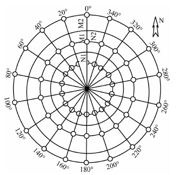 由于套管直径与几千米的套管长度相比可以忽略不计,所以套管可作为线电流源处理.监测电极M(M1,M2,…)、N(N1,N2,…)布置方式如图 1所示,以压裂层位在地表投影为中心圈状布极,计算同一方向各圈压裂前后地表电位梯度与极化电位.