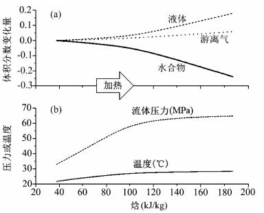 从图 1显示的过程可以看出:如果水合物采样器是一个密闭的体系, 在提升过程中, 由于外界温度变大, 将有热能输入到密闭采样器内部, 相当于一个加热过程, 这会导致密闭器内部的流体压力变大; 同时, 随着采样器的提升, 水合物的各相态可能发生变化.如果原来存在有固态水合物, 则有可能因为温度和压力的变化导致分解, 即甲烷在不同相态(固、液、气)下的比例是变化的.理论上, 这个过程是可逆的.因此, 如果已知地表条件下甲烷在不同的相态(固、液、气)下比例, 再把温度和压力恢复到海底原始条件, 则有可能估计出原始条件下甲烷在不同的相态(固、液、气)的比例, 如果固体相的饱和度不为零, 则有甲烷水合物存在.