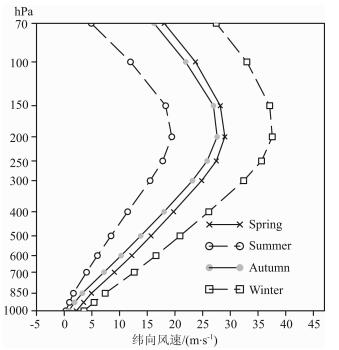 图 9 不同季节沿40°N平均的纬向风随高度分布 Fig. 9 Vertical distribution of seasonal zonal wind speed at 40°N |