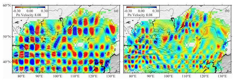 (4) 速度异常还可能与应力环境有关.挤压环境呈现速度高异常,如研究区的西部,主要受到印度板块与欧亚板块的碰撞挤压作用而处于近南北向的挤压状态中,因而呈现总体高速度异常;拉张环境呈现速度低异常,如研究区北部的贝加尔湖地区,以及东部大同盆地和渤海湾.