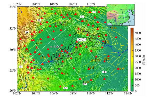 图 1 三峡库区及邻近地区地貌与构造图 三角表示地震台,圆点表示城市,黄线表示断层,白线(AA′,BB′,CC′和DD′)表示与图 7所对应的垂直剖面位置,黑线封闭区域为三峡库区. Fig. 1 Topographic relief and tectonic map of the Three Gorges Reservoir and the adjacent region The triangles denote seismic stations used in this study. The black circles denote cities.The yellow lines denote faults.The white lines (AA′, BB′, CC′, DD′and EE′) indicate the vertical profiles shown in Fig.7, and the enclosed area by black lines is the Three Gorges Reservoir area. |