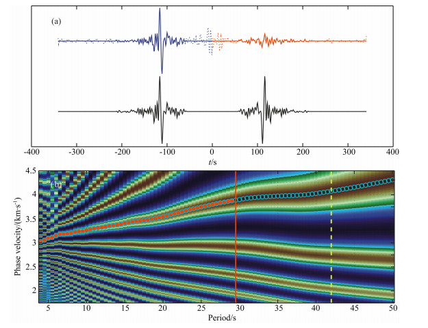 图 3显示由渝北台(YUB)-吉首台(JIS)对地震背景噪声数据互相关提取面波经验格林函数分析得到的相速度频散曲线.可以看出瑞利波相速度随周期增加而变大,频散现象明显.其校正后的台站间距为342 km,瑞利面波相速度频散曲线的测量的最大截止周期为29 s.由图 3a可见,噪声相关函数在先经过希尔伯特变换之后,再经过正向与逆向波形的反序平均后得到经验格林函数.