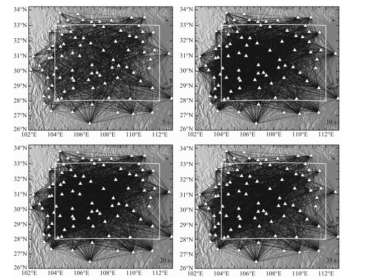 图 4 研究区内不同周期的相速度测量的射线覆盖分布图 Fig. 4 Path coverage of velocity measurements at four selected periods |