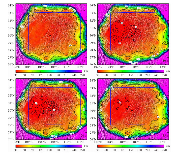 目前对地震层析成像结果质量评价一般采用检测板技术,这种方法是用理论速度模型加一定扰动进行反演,分析反演结果能否恢复给定的理论速度模型.但Leveque等[20]人研究认为,直接根据检测板结果进行分辨率分析和误差估计可能存在误差. Yanovskaya等[21-22]认为可以通过计算模型中的每个格点空间平均分辨率核函数,并用来表示层析成像的结果分辨率更为合适.根据相速度分布特征,图 5给出了与图 4对应的周期为5 s,10 s,20 s,35 s的分辨率半径分布图.图 4与图 5表明,地震射线的分布与成像结果的分辨率存在一定的关系,即地震射线的密度与数量越多成像结果的分辨率就越高,反之亦然.例如,研究区边缘的分辨率较差,这主要是由于研究区边缘地区密度息射线少造成.总体上来说,本文中射线覆盖较均匀的地区最小分辨率可达60 km,整个研究区控制在210 km的分辨率.本文研究的区域890 km×560 km,计算得到的空间平均分辨率半径在60~210 km之间,正好位于模型参数所允许的光滑半径之内.