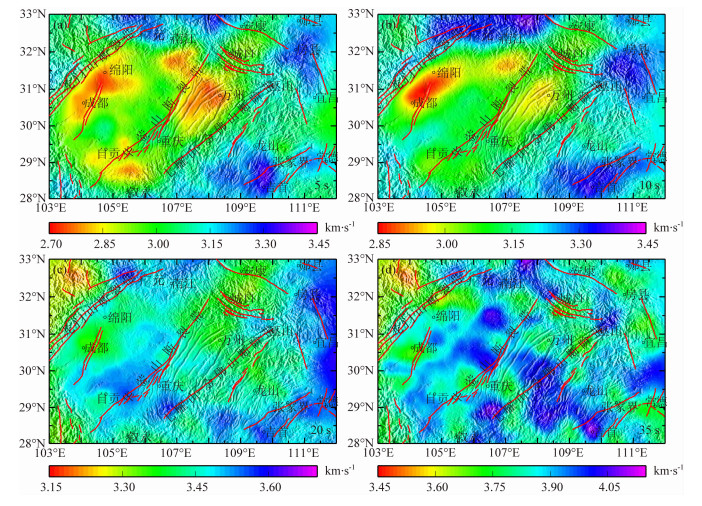 3.2 相速度层析成像结果与分析本文采用Yanovskaya和Ditmar[22]提出的层析成像方法,该方法是在Backus等[23]人的一维地球物理反演理论和方法上发展而来,是目前面波层析成像中广泛应用的方法之一.反演时把研究区域划分为0.2°× 0.2°网格,而控制着反演结果的光滑程度的正则化参数,在反演时我们经过反复试验确定其值为0.2,这将确保成像结果在具有足够光滑度的同时又有较好的拟合度.图 6给出了与图 4、图 5对应的周期为5、10、20和35 s的相速度层析成像的分布图.