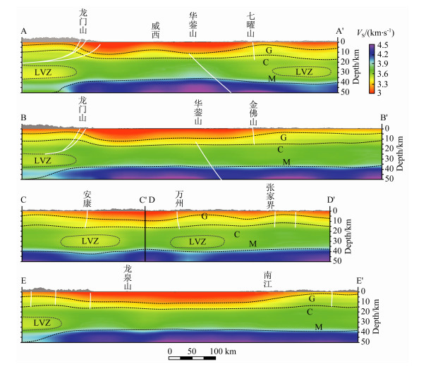 四川盆地的东北边界大巴山构造带位于扬子地块北缘,也是四川盆地与秦岭造山带的过渡部位.从图 7剖面CC′可以看出位于大巴山构造带附近的安康下方莫霍面呈下凹趋势.这可能和大巴山与川东北前陆盆地突变型盆山结构有关.刘树根等[34]认为该盆山体系是扬子陆块自南向北的低角度长距离陆内俯冲深部背景下,南秦岭中上地壳自北向南展式滑脱与逆冲推覆扩展变形而形成.另外,由CC′及DD′剖面可以看出,在安康及万州下方中下地壳存在明显的低速带,并延伸到莫霍面以下,表明可能存在上地幔深部流体上涌通道.有研究认为位于万州附近的普光气田的天然气可能是无机成因的[28],我们的结果为此观点提供了一定佐证.这些剖面中的地幔顶部剪切波速度分布与Li等[14-15]使用台站间到时差方法得到的Pn速度有较好的对应,表明本文数据对地幔顶部有一定分辨能力.