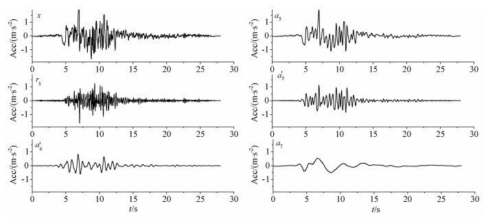 以Kocaeli,Turkey地震Gebze台站地震动为例,将实际地震动加速度时程分解得到一组加速度分量时程(见图 1).其中x为原始地震动序列,x=a5+r5;a5为通过对尺度空间V5中的低频系数重构得到的分量;a′6为对(x-a7)进行多尺度分解,由V6中低频系数重构得到;a′5为对(x-a7-a′6)进行多尺度分解,由V5中低频系重构得到.经验证a5≈a′5+ a′6+a7,且误差可忽略不计.