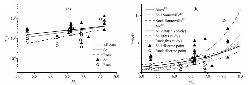图 10 周期衰减关系 (a)-本文Tp衰减关系;(b)-本文回归得到的脉冲周期和震级的经验关系与前人结果的比较. Fig. 10 Attenuation relationship of period (a) Attenuation relationship of Tp(in this study); (b) Variation formula of pulse period with moment magnitude obtained in this study compared with former relationship. |