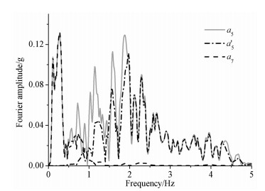 为说明各分量在频域上相互之间的独立性及其与原始地震动的关系,对各分量的傅里叶谱和反应谱进行了对比分析.从分量的傅里叶谱(见图 2)可看出,a′5与a7的傅里叶谱的相交面积很小,说明分解得到的各分量分布在不同的频率范围.同时,a′5、a7分别与a5在低频和高频范围内基本重合.傅里叶分析能够精确定位信号的频域信息,且通过傅里叶滤波可以得到信号的高低频分量.为进一步体现多尺度分解在频域上的精确性,对比分析了由两种方法得到的分量的反应谱(见图 3).在多尺度分解方法中低频采用a7,高频采用r7=x-a7;在傅里叶方法中,低频成分是通过阻断频率为1.67 Hz的低通滤波得到,高频由相同截断频率的高通滤波得到.两种方法获得的分量反应谱表明,多尺度分解方法与傅里叶方法在频域上具有相同的精确性.