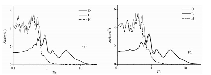图 3 反应谱对比图 (a)傅里叶方法分解各分量反应谱图形;(b)多尺度分解方法分解各分量反应谱图形;O-原始地震动;L-低频成分;H-高频成分. Fig. 3 Response spectra comparison diagram (a) By Fourier method; (b) By multiscale decompose method; O-Original ground motion; L-Low frequency component; H-High frequency component. |