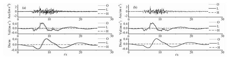 图 4 时程对比图 (a)傅里叶分解方法时程图;(b)多尺度分解方法时程图;O-原始地震动;L-低频成分;H-高频成分. Fig. 4 Time-histories comparison diagram (a) Time-histories through Fourier method; (b) Time-histories through multiscale decompose method; O-Original ground motion; L-Low frequency component; H-High frequency component. |