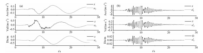 由动力学的基本知识可知,长周期体系对低频分量和原始地震动的动态响应应该一致;短周期体系对高频分量和原始地震动的动态响应应该一致. 图 5a为原始地震动与a7分量作用在周期为14.5 s的单自由度体系上计算得到的加速度、速度与位移时程.图 5b为原始地震动与a′5分量作用在周期为0.5 s的单自由度体系上计算得到的响应时程.图 5表明通过多尺度分解方法得到的各频率分量,除与原始地震动在时域和频域内皆吻合外,在对体系的动态响应方面也能与原始地震动保持一致.